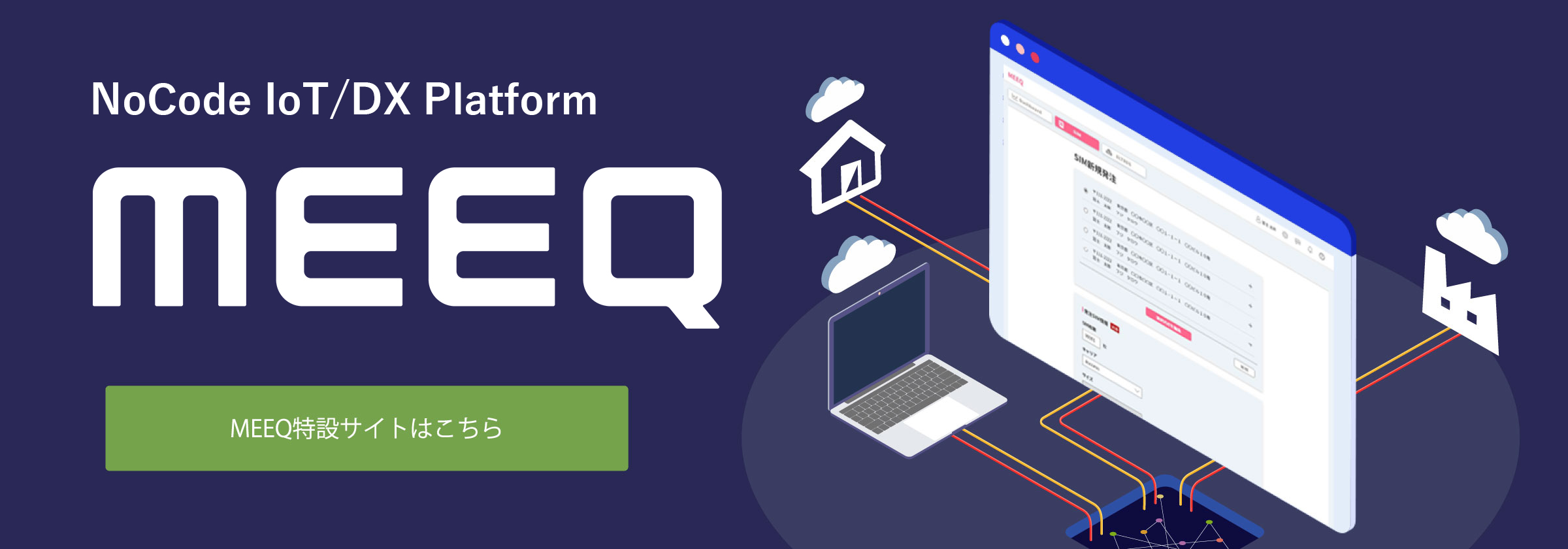 MEEQ NoCode IoT/DX Platform MEEQでお客様の事業に簡単にIoT回線を追加できます。