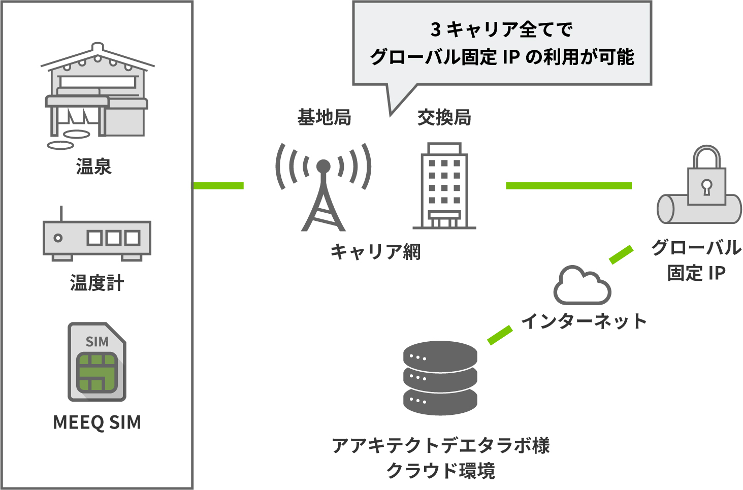 温泉は携帯電話の基地局から陰になる場所も多く、通信電波状況は良好とは限りません。また、サービスの仕様上、端末には固定IPアドレスが必要という制約もありました。そこで、これまでは、エリアが広いと認識されている特定のキャリアのネットワークを使ったMVNOによるデータ通信サービスを利用しておりました。しかし、施設の場所によっては電波が届かず、対応できないことが悩みの種でした。通信ができなかったために温泉・温浴施設からのサービス導入の依頼を断ったり、計測設備から離れたところにアンテナやルーターを設置して長いケーブルを引き回したりしたこともありました。