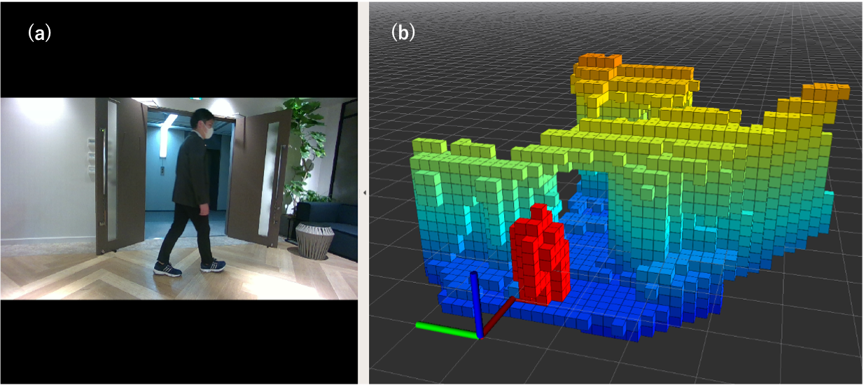 - ステレオカメラまたは深度センサーを用いることで、入力映像から3次元空間情報を取得し、細かいキューブで構成される3次元空間マップを生成(図1)