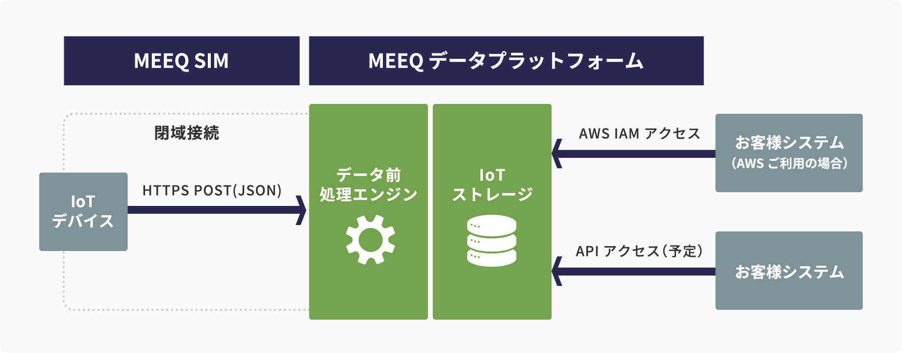 MEEQデータプラットフォーム IoTストレージは、MEEQで接続されたIoTデバイスからアップロードされるデータを処理するサービスで、