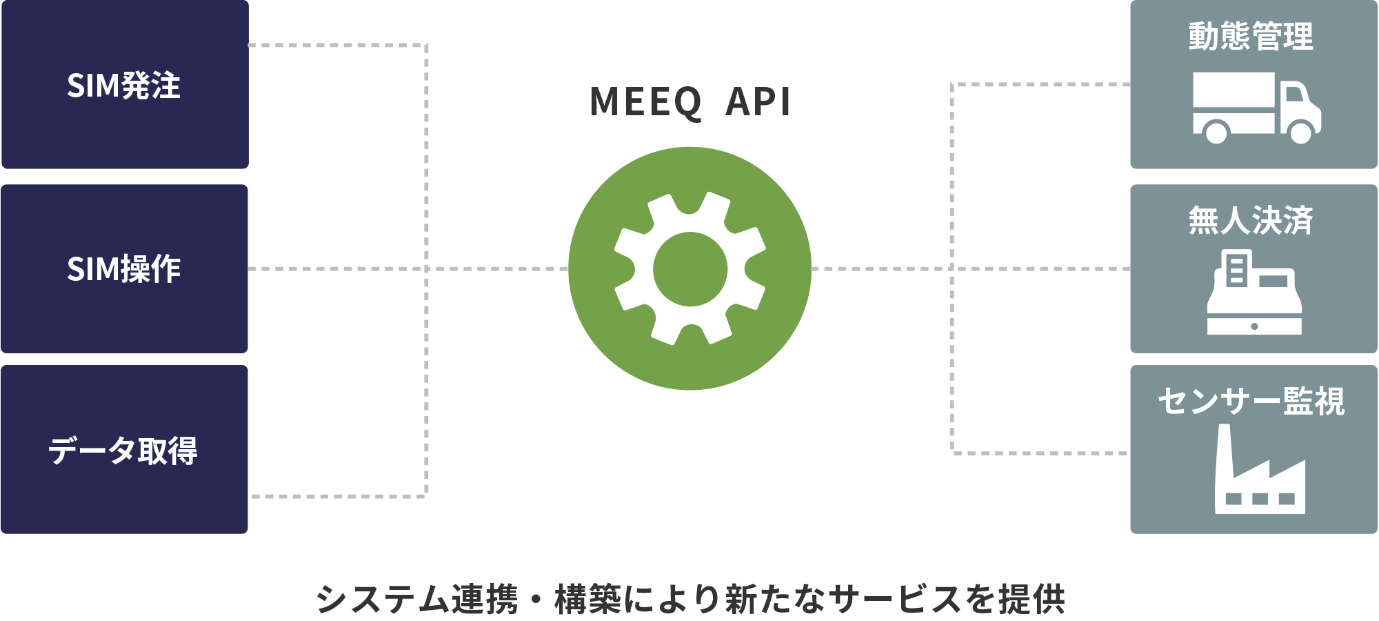 MEEQ APIは、これまでMEEQコンソールでしかできなかった回線の発注やデータチャージ・利用停止などの操作、データ利用量や利用料金などの情報取得が可能になるWebAPIです。これを応用することにより、企業や行政機関・自治体が運用しているシステムにSIMの情報を連携することや、MEEQ SIMを利用したサービスを提供している事業者がエンドユーザー向けの独自のコンソールを用意するなど、様々なニーズに合わせたサービスの展開や運用が可能になります。