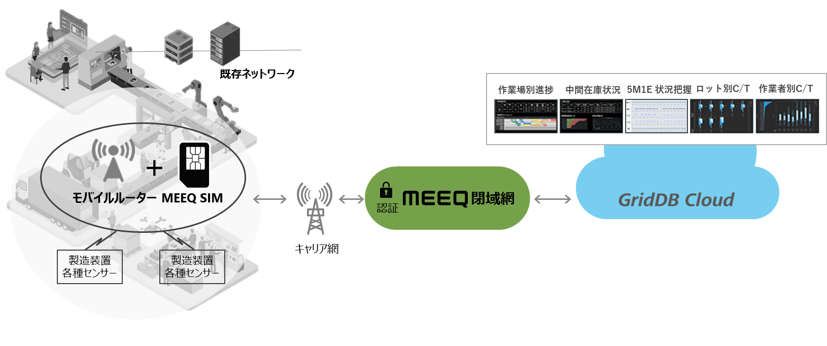 東芝デジタルソリューションズ株式会社(本社:神奈川県川崎市、取締役社長:岡田 俊輔、以下 東芝デジタルソリューションズ)とソニーグループのミーク株式会社(本社:東京都渋谷区、代表取締役 執行役員社長:峯村 竜太、以下 ミーク)は、ミークのIoT向けモバイルデータ通信網を強みとするNoCode IoT/DX Platform「MEEQ」を使って集めたIoTデータを、東芝デジタルソリューションズのIoT向けクラウドデータ基盤「GridDB Cloud」に蓄積し、活用できることを両社共同で検証、正常に動作することを確認しました。両社は、「GridDB Cloud」と「MEEQ」を組み合わせたIoTプラットフォームをお客さまに提案していきます。