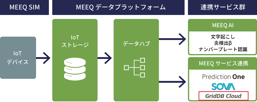 両サービス間の連携は、「MEEQデータプラットフォーム データハブ」を介して行います。データハブはMEEQと各種SaaSと連携するためのハブで、MEEQ AIサービス群、予測分析ツール『Prediction One』、ノーコード業務アプリケーションSaaS『SOVA』などとの連携機能をすでに提供しています。今回、新たに『GridDB Cloud』と連携することで、IoTデバイスとビッグデータ・IoT向けデータベースGridDB Cloudを容易に組み合わせて使用することが可能になります。