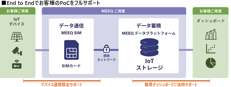 近年、モバイル通信やAIをはじめとするデータ処理・分析といった様々な技術が発展したことで、IoTによるイノベーションを創出する企業が増加しています。IoTサービスの開発では、サービスの簡易版を試作してPoCを行う工程が一般的ですが、セキュリティルールに準拠した通信環境の構築が課題となるケースが多くあります。ミークでは、こうした課題に対し、SIMによるコネクティビティからデータストレージまでを閉域ネットワークでセキュアに通信し、IoTストレージにデータを蓄積できる『MEEQ データプラットフォーム IoTストレージ』を提供しています。