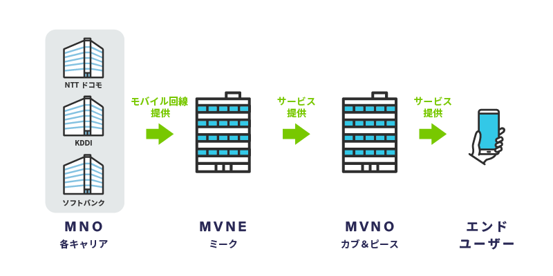 当社はMVNEとして、MVNO(格安SIMサービス事業者等)に向けてモバイル通信回線の提供を中心に、独自プランの設計、配送・キッティングなど、事業運営に必要な様々な機能を提供しています。