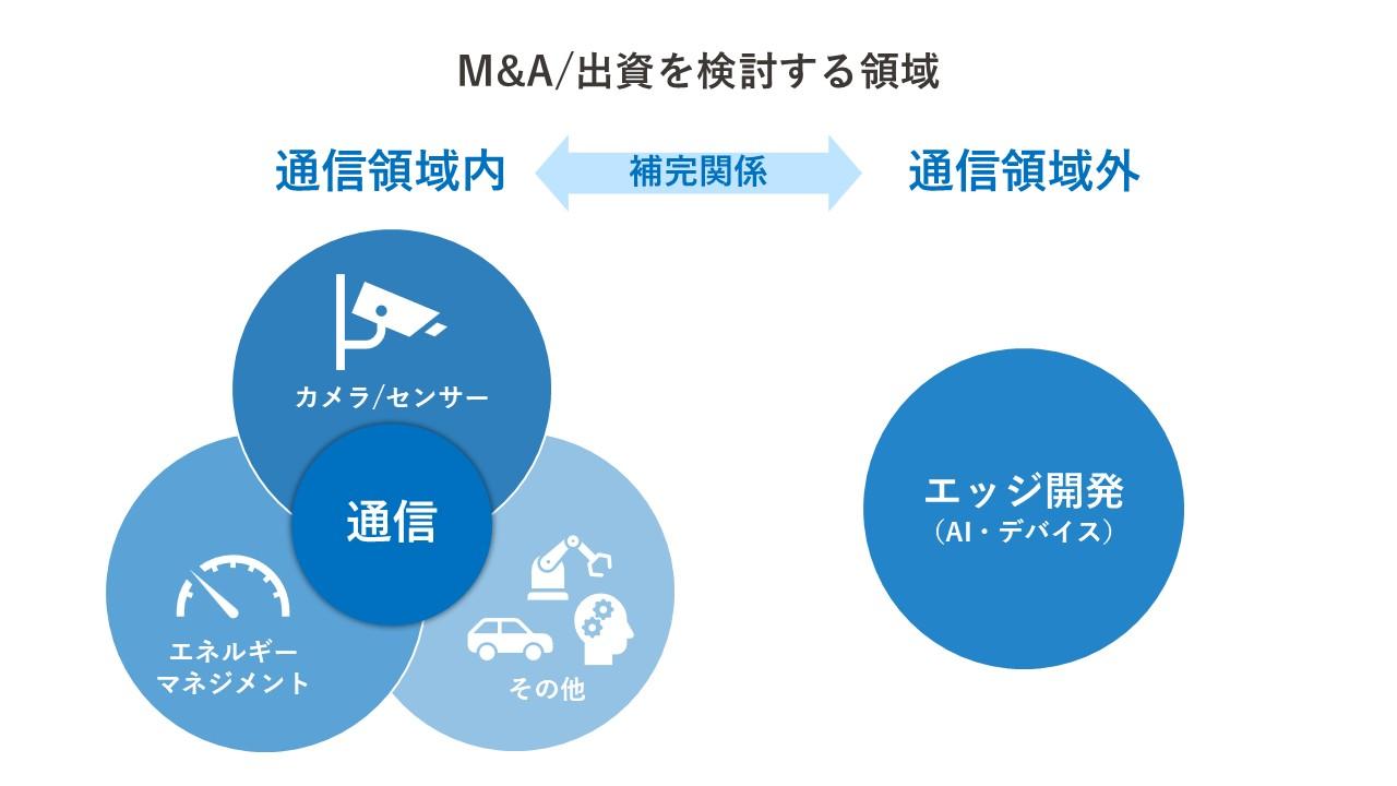 M&A/出資については、当社のインオーガニックな成長を加速させる柱の1つとして位置付けております。通信領域内では、他社MVNO事業の統合による規模拡大を目指すほか、カメラ/センサーをはじめ、エネルギーマネジメント等の様々なソリューションへのM&A/出資を検討しています。また、通信領域外のセグメントについても積極的に戦略的な投資を検討しています。